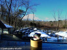ようこそいらっしゃいました! はぁ〜っ、氷点下の空気は冷たい。 ここです!やってきました。 僕は男なのさ♪ はぁ〜、極楽極楽♪♪ 露天風呂からの富士山 これにかぎる! 湯上りは味噌おでん♪