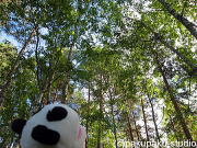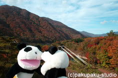 さ、犯人パンダを追いかけるぞ! | (その頃犯人パンダは…) お腹いっぱいになって、ひと足先に 紅葉の山々に戻っていました。 (つづく) |