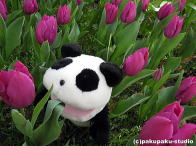 朝のパンダ散歩〜♪ ふわ〜 今日も快晴です! あったかいですね♪ あ♪ パンダ子さん、タンポポですよ♪ …ぱく♪ …。