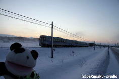 日の出少し前です 道路は歩くのも大変なほど凍ってます 雪煙を上げて走る富良野線下り普通列車 AM7時前、美瑛町に着きました。