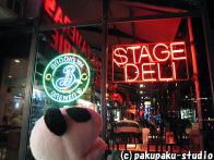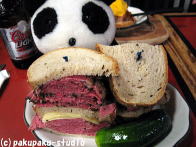 ふん♪ふん♪ 夜がふけてきました パンダ子はおなかがすいてきました 今晩はデリで軽めにすませましょう はい、パストラミサンドです♪ まるごとピクルスもどうぞ〜♪(軽くはないアメリカご飯なのでした)