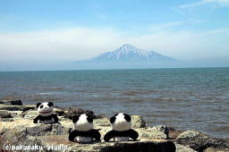 じゃん!晴れました♪ 日本海岸沿いの道をやってきました 向こうに見えるのは利尻島ですよ!