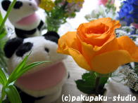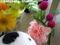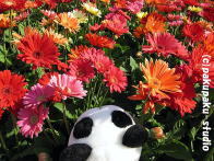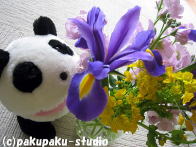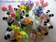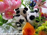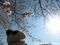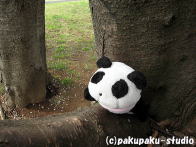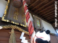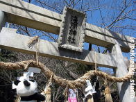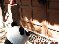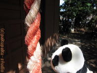 パンダは浅間神社にやってきました お参りしましょう よいしょ、よいしょ (ぜーはー) ガラガラ せかいがへいわになりますように あ、お花♪