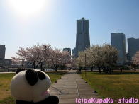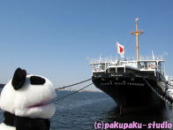 桜木町で桜を堪能したパンダは 汽車道を抜けて 途中でお花にかこまれ カップルを横目に この船だな… さあ、出発しよう!