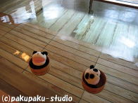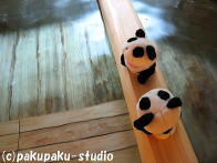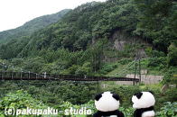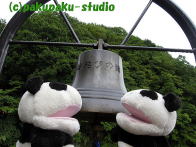 今日は雨があがりましたね ではお散歩にでかけようパン村くん♪ あっ、吊り橋があります。渡ってみましょう おお〜揺れる揺れる〜 パン村くん♪ なんですか、パンダ川先生 縁結びの鐘だ♪