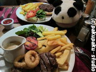 ご飯をたべて気分転換しよう♪僕はステーキをたべるよパンムズ♪ ぼくはハンバーガーにしておくよワトソン 地元の人が集まるレストランは