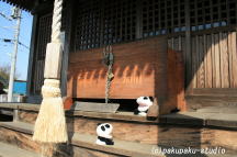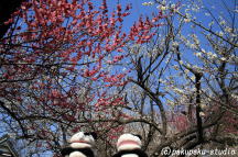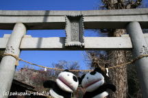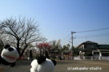 (がんばりましょうパンダ子さん)着きましたわ♪ 梅が咲いていますね♪ パンダ子さん、まずはお参りしましょう♪