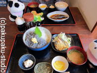 兄弟船は〜♪ おなかがすきました兄貴ぃ♪ ここでランチにしようパンダ郎! パンダ郎はこの生しらす丼というのを