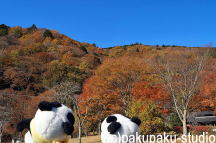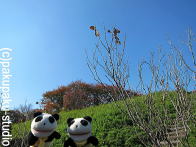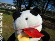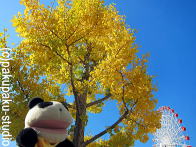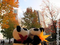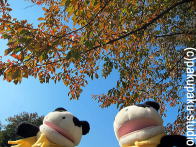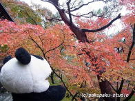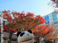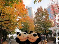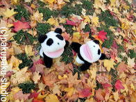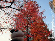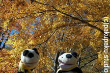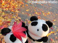 今日はイマルさんと待ち合わせ♪ ぱんだ子さん、おまたせ〜!いえ〜い! はっぱがきれいに色づきましたね〜♪ イマルさん、赤がおにあいよ! ぱんだ子は黄色が好き。