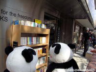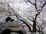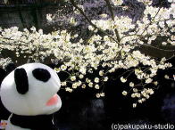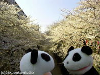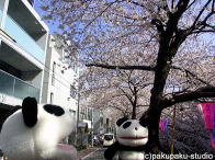 今日はパンダ子さんとお花見デート♪ あ!パンダ子さん、こちらです! ここが有名な目黒川ですよ おしゃれな本屋さんもありますよ 桜が川の光で輝いて見えますわ♪ 春の風が気持ちいいですわ