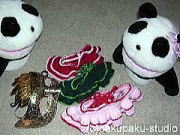 毛皮のコート、ゴールドのネックレス、イヤリング、リボン、金塊 夢見て買っちゃいました(^^) 「白黒田ご夫妻」からの引き出物ですわ〜